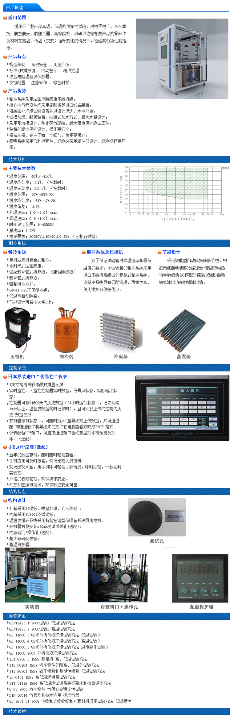 本類試驗(yàn)箱符合國家標(biāo)準(zhǔn)GB10589《低溫試驗(yàn)箱技術(shù)條件》和GB11158《高溫試驗(yàn)箱技術(shù)條件》,具體設(shè)備參數(shù)以技術(shù)協(xié)議為準(zhǔn)。極寬的溫度控制范圍,可滿足GB/T2423《電工電子產(chǎn)品基本試驗(yàn)規(guī)程》1、2、3、4項(xiàng)的試驗(yàn)要求。獨(dú)特的平恒調(diào)溫控制,可進(jìn)行高精度,高穩(wěn)定的溫度控制。嵌入式計(jì)算機(jī)系統(tǒng),可選配485通訊接口,便于遠(yuǎn)距離控制和中央集中控制?捎涗90天的試驗(yàn)數(shù)據(jù)(相當(dāng)于配備無紙記錄儀)。